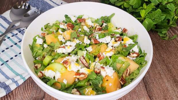Когда наступают августовские деньки, на столе в изобилии появляются свежие фрукты и ягоды и различные блюда из них. Это могут быть не только десерты, но и масса других, не менее аппетитных яств. Например, салат с дыней, руколой, фетой, огурцом и орехами прекрасно впишется в летнее меню, благодаря сбалансированному составу и простоте приготовления.