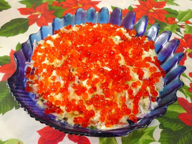 Салат «Царский» с семгой и красной икрой будет достойным центральным блюдом праздничного стола.