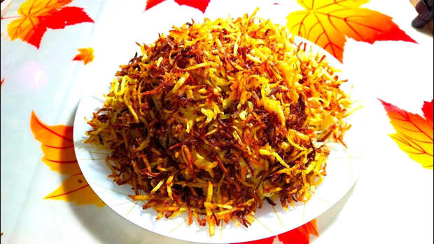Новогодний салат «Стог сена» представляет собой тонко нашинкованный картофель, обжаренный до хрустящей корочки, покрывающий салат типа оливье или любой слоенный по выбору.