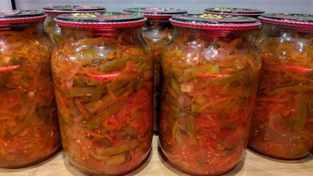 Этот сочный витаминный салат со спаржевой фасолью и помидорами на зиму станет полезной заготовкой из летних овощей. Подавайте его к отварному рису или овощным блюдам. Его удивительно просто приготовить.