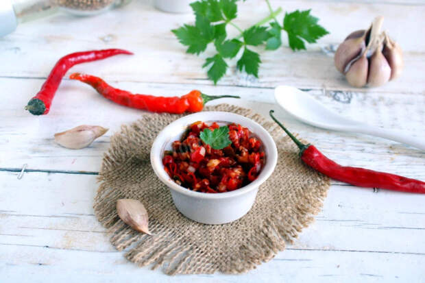 Острый перец с чесноком – приправа, которую можно применить зимой, добавляя в первые и вторые блюда. Рецепт подходит для стручков, которые немного подсохли, но не были израсходованы.