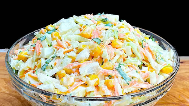 Полезный и красочный капустный салат с яйцом и кукурузой сочетает в себе хрустящую основу с большим количеством белка и натуральных углеводов, содержащихся в сладких кукурузных зернах.